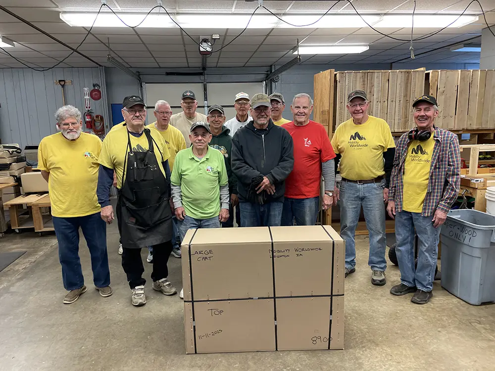 Shop members gather for reflection when a milestone cart box is filled – this time #8900! They take pride in their part of the process knowing every time a cart is packed, a person on the other side of the world will receive an extraordinary Gift of Mobility which they never dreamed possible. We will likely never meet the recipient but rejoice with them knowing they immediately experience the gift of dignity and hope.